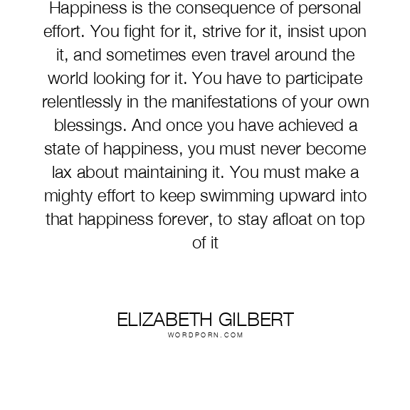 Happiness is the consequence of personal effort. You fight for it, strive for it, insist upon it, and sometimes even travel around the world looking for it. You have to participate relentlessly in the manifestations of your own blessings. And once you have achieved a state of happiness, you must never become lax about maintaining it. You must make a mighty effort to keep swimming upward into that happiness forever, to stay afloat on top of it