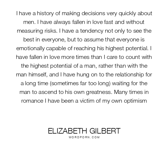 I have a history of making decisions very quickly about men. I have always fallen in love fast and without measuring risks. I have a tendency not only to see the best in everyone, but to assume that everyone is emotionally capable of reaching his highest potential. I have fallen in love more times than I care to count with the highest potential of a man, rather than with the man himself, and I have hung on to the relationship for a long time (sometimes far too long) waiting for the man to ascend to his own greatness. Many times in romance I have been a victim of my own optimism