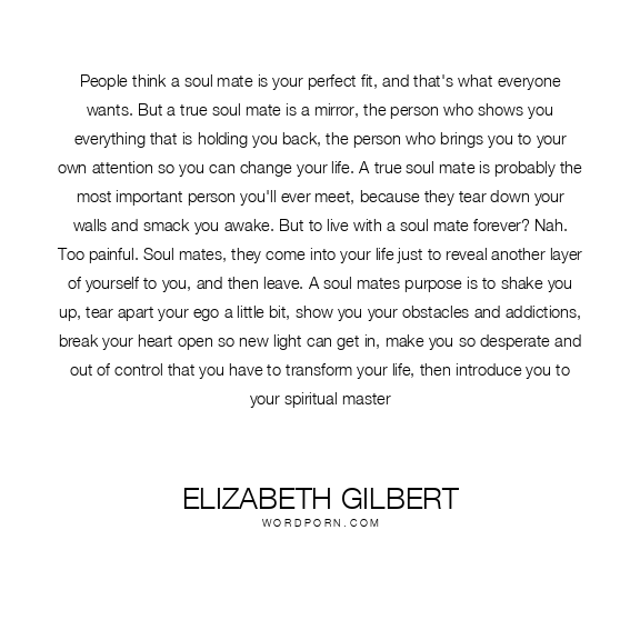People think a soul mate is your perfect fit, and that's what everyone wants. But a true soul mate is a mirror, the person who shows you everything that is holding you back, the person who brings you to your own attention so you can change your life. A true soul mate is probably the most important person you'll ever meet, because they tear down your walls and smack you awake. But to live with a soul mate forever? Nah. Too painful. Soul mates, they come into your life just to reveal another layer of yourself to you, and then leave. A soul mates purpose is to shake you up, tear apart your ego a little bit, show you your obstacles and addictions, break your heart open so new light can get in, make you so desperate and out of control that you have to transform your life, then introduce you to your spiritual master