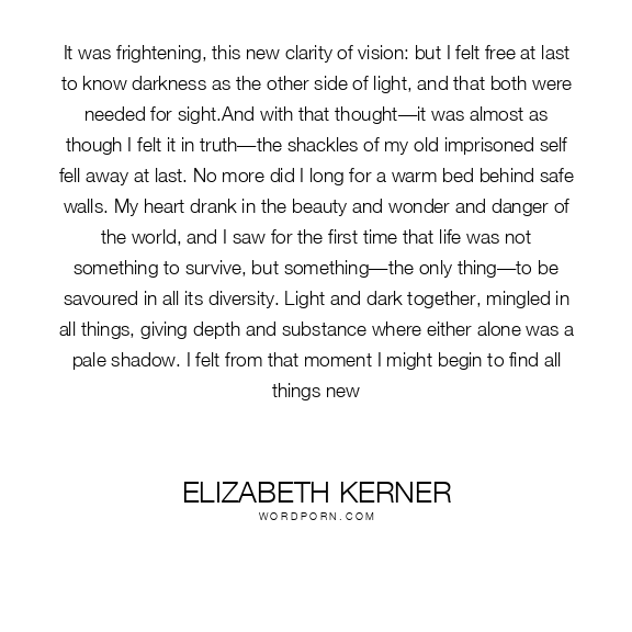 It was frightening, this new clarity of vision: but I felt free at last to know darkness as the other side of light, and that both were needed for sight.And with that thought—it was almost as though I felt it in truth—the shackles of my old imprisoned self fell away at last. No more did I long for a warm bed behind safe walls. My heart drank in the beauty and wonder and danger of the world, and I saw for the first time that life was not something to survive, but something—the only thing—to be savoured in all its diversity. Light and dark together, mingled in all things, giving depth and substance where either alone was a pale shadow. I felt from that moment I might begin to find all things new