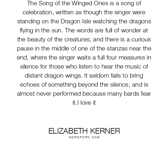 The Song of the Winged Ones is a song of celebration, written as though the singer were standing on the Dragon Isle watching the dragons flying in the sun. The words are full of wonder at the beauty of the creatures; and there is a curious pause in the middle of one of the stanzas near the end, where the singer waits a full four measures in silence for those who listen to hear the music of distant dragon wings. It seldom fails to bring echoes of something beyond the silence, and is almost never performed because many bards fear it.I love it