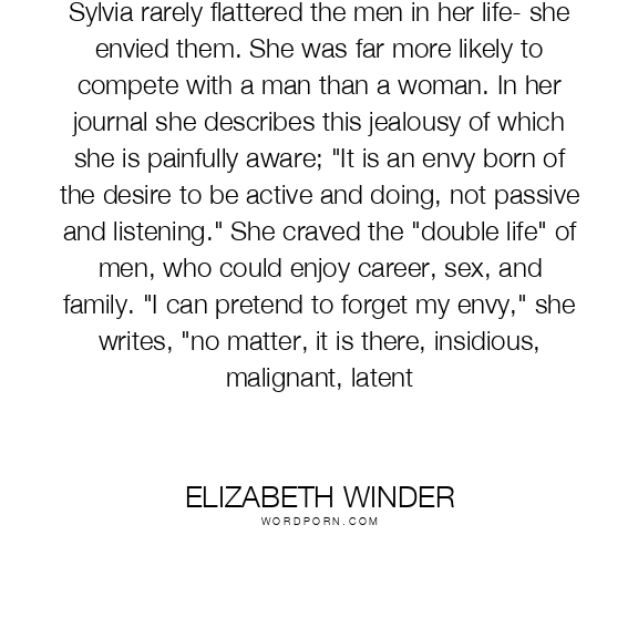 Sylvia rarely flattered the men in her life- she envied them. She was far more likely to compete with a man than a woman. In her journal she describes this jealousy of which she is painfully aware; "It is an envy born of the desire to be active and doing, not passive and listening." She craved the "double life" of men, who could enjoy career, sex, and family. "I can pretend to forget my envy," she writes, "no matter, it is there, insidious, malignant, latent