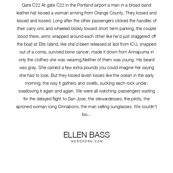 Gate C22 At gate C22 in the Portland airport a man in a broad-band leather hat kissed a woman arriving from Orange County. They kissed and kissed and kissed. Long after the other passengers clicked the handles of their carry-ons and wheeled briskly toward short-term parking, the couple stood there, arms wrapped around each other like he’d just staggered off the boat at Ellis Island, like she’d been released at last from ICU, snapped out of a coma, survived bone cancer, made it down from Annapurna in only the clothes she was wearing.Neither of them was young. His beard was gray. She carried a few extra pounds you could imagine her saying she had to lose. But they kissed lavish kisses like the ocean in the early morning, the way it gathers and swells, sucking each rock under, swallowing it again and again. We were all watching–passengers waiting for the delayed flight to San Jose, the stewardesses, the pilots, the aproned woman icing Cinnabons, the man selling sunglasses. We couldn’t look away. We could taste the kisses crushed in our mouths.But the best part was his face. When he drew back and looked at her, his smile soft with wonder, almost as though he were a mother still open from giving birth, as your mother must have looked at you, no matter what happened after–if she beat you or left you or you’re lonely now–you once lay there, the vernix not yet wiped off, and someone gazed at you as if you were the first sunrise seen from the Earth. The whole wing of the airport hushed, all of us trying to slip into that woman’s middle-aged body, her plaid Bermuda shorts, sleeveless blouse, glasses, little gold hoop earrings, tilting our heads up