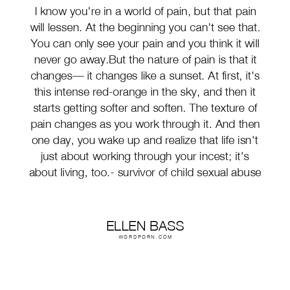 I know you're in a world of pain, but that pain will lessen. At the beginning you can't see that. You can only see your pain and you think it will never go away.But the nature of pain is that it changes— it changes like a sunset. At first, it's this intense red-orange in the sky, and then it starts getting softer and soften. The texture of pain changes as you work through it. And then one day, you wake up and realize that life isn't just about working through your incest; it's about living, too.- survivor of child sexual abuse
