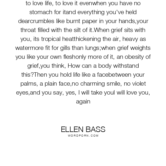 to love life, to love it evenwhen you have no stomach for itand everything you've held dearcrumbles like burnt paper in your hands,your throat filled with the silt of it.When grief sits with you, its tropical heatthickening the air, heavy as watermore fit for gills than lungs;when grief weights you like your own fleshonly more of it, an obesity of grief,you think, How can a body withstand this?Then you hold life like a facebetween your palms, a plain face,no charming smile, no violet eyes,and you say, yes, I will take youI will love you, again