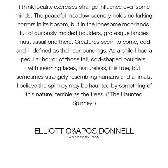 I think locality exercises strange influence over some minds. The peaceful meadow-scenery holds no lurking horrors in its bosom, but in the lonesome moorlands, full of curiously molded boulders, grotesque fancies must assail one there. Creatures seem to come, odd and ill-defined as their surroundings. As a child I had a peculiar horror of those tall, odd-shaped boulders, with seeming faces, featureless, it is true, but sometimes strangely resembling humans and animals. I believe the spinney may be haunted by something of this nature, terrible as the trees. ("The Haunted Spinney")