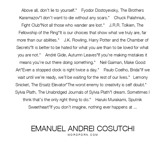 Above all, don’t lie to yourself." – Fyodor Dostoyevsky, The Brothers Karamazov"I don’t want to die without any scars." – Chuck Palahniuk, Fight Club"Not all those who wander are lost." – J.R.R. Tolkien, The Fellowship of the Ring"It is our choices that show what we truly are, far more than our abilities." – J.K. Rowling, Harry Potter and the Chamber of Secrets"It is better to be hated for what you are than to be loved for what you are not." – André Gide, Autumn Leaves"If you’re making mistakes it means you’re out there doing something." – Neil Gaiman, Make Good Art"Even a stopped clock is right twice a day." – Paulo Coelho, Brida"If we wait until we’re ready, we’ll be waiting for the rest of our lives."– Lemony Snicket, The Ersatz Elevator"The worst enemy to creativity is self-doubt." – Sylvia Plath, The Unabridged Journals of Sylvia Plath"I dream. Sometimes I think that’s the only right thing to do." – Haruki Murakami, Sputnik Sweetheart"If you don’t imagine, nothing ever happens at all." – John Green, Paper Towns"Everything is possible. The impossible just takes longer." – Dan Brown, Digital Fortress"Fear is an illusion..." - Dark Templar, Starcraft 2
