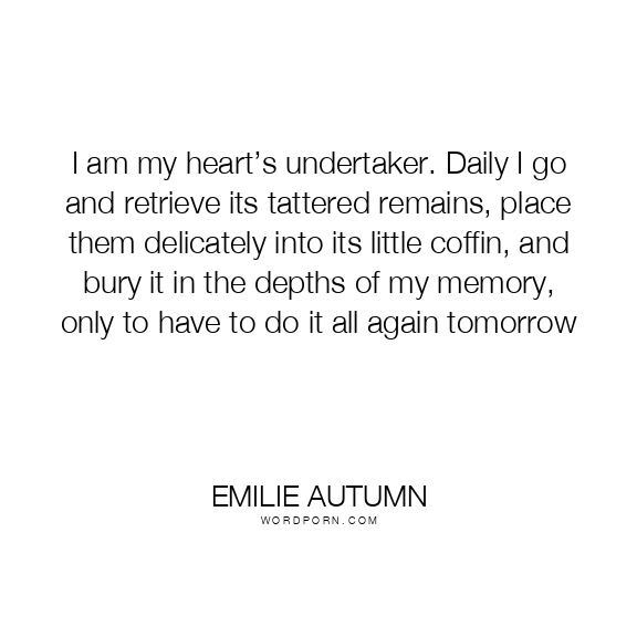 I am my heart’s undertaker. Daily I go and retrieve its tattered remains, place them delicately into its little coffin, and bury it in the depths of my memory, only to have to do it all again tomorrow