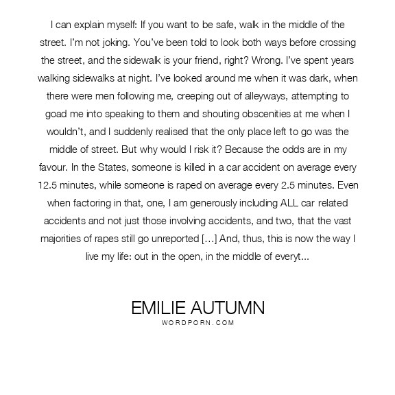 I can explain myself: If you want to be safe, walk in the middle of the street. I’m not joking. You’ve been told to look both ways before crossing the street, and the sidewalk is your friend, right? Wrong. I’ve spent years walking sidewalks at night. I’ve looked around me when it was dark, when there were men following me, creeping out of alleyways, attempting to goad me into speaking to them and shouting obscenities at me when I wouldn’t, and I suddenly realised that the only place left to go was the middle of street. But why would I risk it? Because the odds are in my favour. In the States, someone is killed in a car accident on average every 12.5 minutes, while someone is raped on average every 2.5 minutes. Even when factoring in that, one, I am generously including ALL car-related accidents and not just those involving accidents, and two, that the vast majorities of rapes still go unreported […] And, thus, this is now the way I live my life: out in the open, in the middle of everything, because the middle of the street is actually the safest place to walk