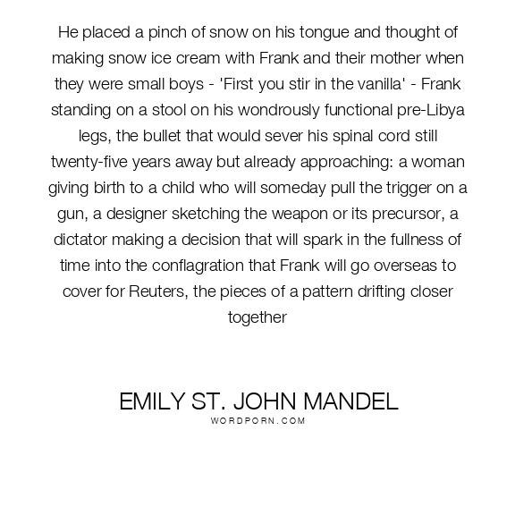 He placed a pinch of snow on his tongue and thought of making snow ice cream with Frank and their mother when they were small boys - 'First you stir in the vanilla' - Frank standing on a stool on his wondrously functional pre-Libya legs, the bullet that would sever his spinal cord still twenty-five years away but already approaching: a woman giving birth to a child who will someday pull the trigger on a gun, a designer sketching the weapon or its precursor, a dictator making a decision that will spark in the fullness of time into the conflagration that Frank will go overseas to cover for Reuters, the pieces of a pattern drifting closer together
