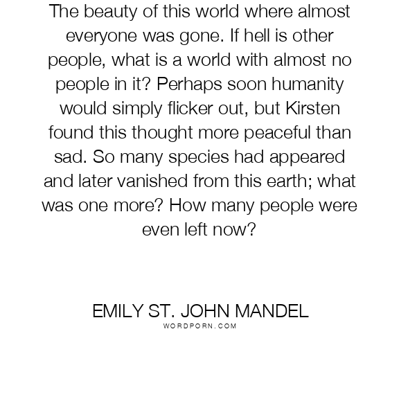 The beauty of this world where almost everyone was gone. If hell is other people, what is a world with almost no people in it? Perhaps soon humanity would simply flicker out, but Kirsten found this thought more peaceful than sad. So many species had appeared and later vanished from this earth; what was one more? How many people were even left now?