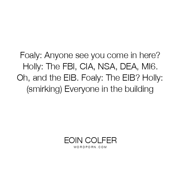 Foaly: Anyone see you come in here? Holly: The FBI, CIA, NSA, DEA, MI6. Oh, and the EIB. Foaly: The EIB? Holly: (smirking) Everyone in the building