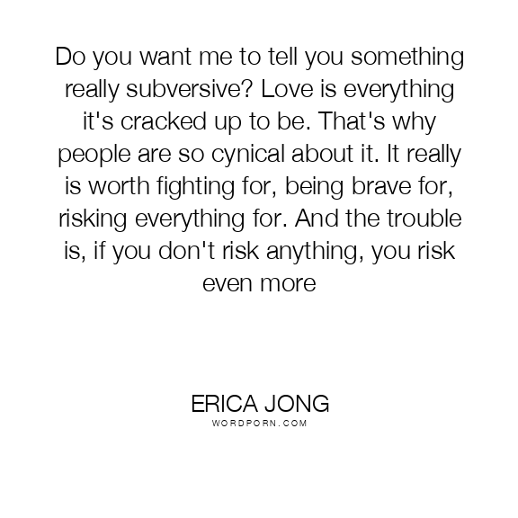 Do you want me to tell you something really subversive? Love is everything it's cracked up to be. That's why people are so cynical about it. It really is worth fighting for, being brave for, risking everything for. And the trouble is, if you don't risk anything, you risk even more