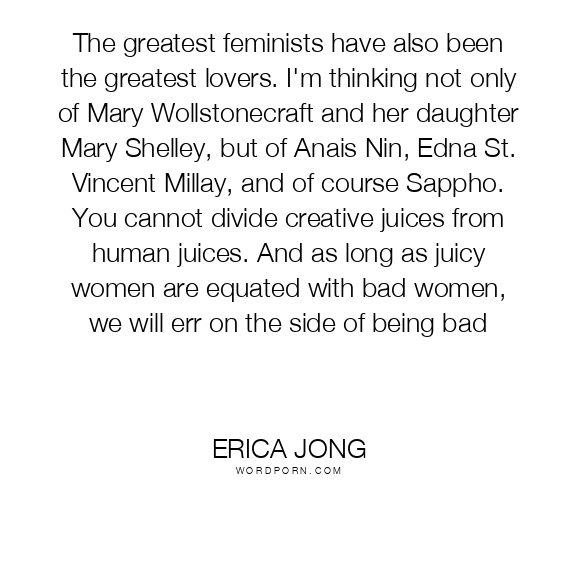 The greatest feminists have also been the greatest lovers. I'm thinking not only of Mary Wollstonecraft and her daughter Mary Shelley, but of Anais Nin, Edna St. Vincent Millay, and of course Sappho. You cannot divide creative juices from human juices. And as long as juicy women are equated with bad women, we will err on the side of being bad