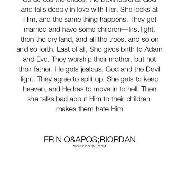 So across the chaos, the Devil looks at God and falls deeply in love with Her. She looks at Him, and the same thing happens. They get married and have some children—first light, then the dry land, and all the trees, and so on and so forth. Last of all, She gives birth to Adam and Eve. They worship their mother, but not their father. He gets jealous. God and the Devil fight. They agree to split up. She gets to keep heaven, and He has to move in to hell. Then she talks bad about Him to their children, makes them hate Him