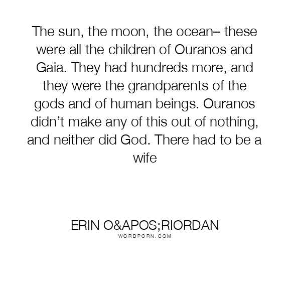 The sun, the moon, the ocean– these were all the children of Ouranos and Gaia. They had hundreds more, and they were the grandparents of the gods and of human beings. Ouranos didn’t make any of this out of nothing, and neither did God. There had to be a wife
