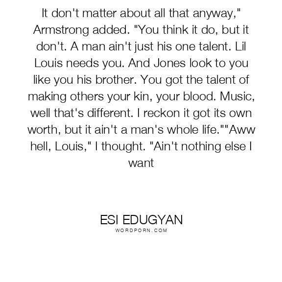 It don't matter about all that anyway," Armstrong added. "You think it do, but it don't. A man ain't just his one talent. Lil Louis needs you. And Jones look to you like you his brother. You got the talent of making others your kin, your blood. Music, well that's different. I reckon it got its own worth, but it ain't a man's whole life.""Aww hell, Louis," I thought. "Ain't nothing else I want
