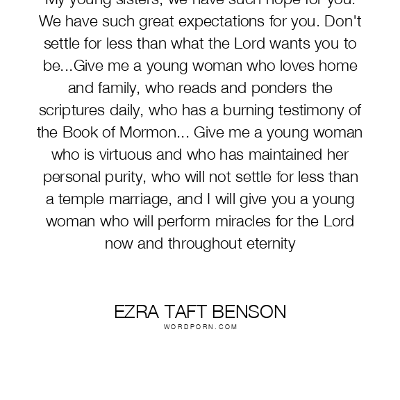 My young sisters, we have such hope for you. We have such great expectations for you. Don't settle for less than what the Lord wants you to be...Give me a young woman who loves home and family, who reads and ponders the scriptures daily, who has a burning testimony of the Book of Mormon... Give me a young woman who is virtuous and who has maintained her personal purity, who will not settle for less than a temple marriage, and I will give you a young woman who will perform miracles for the Lord now and throughout eternity