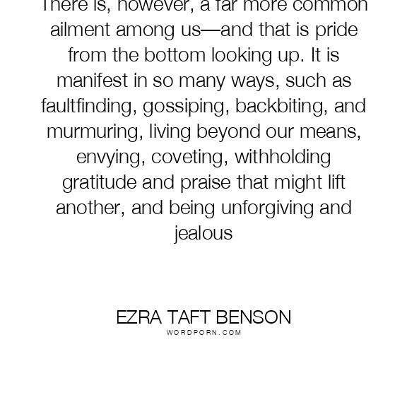 There is, however, a far more common ailment among us—and that is pride from the bottom looking up. It is manifest in so many ways, such as faultfinding, gossiping, backbiting, and murmuring, living beyond our means, envying, coveting, withholding gratitude and praise that might lift another, and being unforgiving and jealous