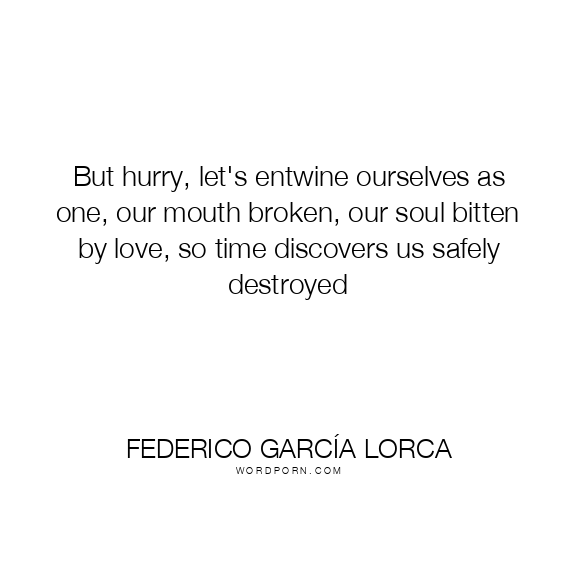 But hurry, let's entwine ourselves as one, our mouth broken, our soul bitten by love, so time discovers us safely destroyed
