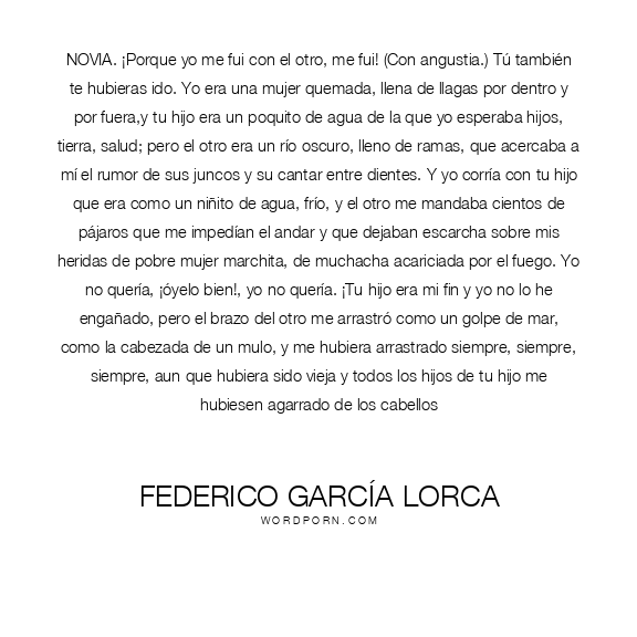 NOVIA. ¡Porque yo me fui con el otro, me fui! (Con angustia.) Tú también te hubieras ido. Yo era una mujer quemada, llena de llagas por dentro y por fuera,y tu hijo era un poquito de agua de la que yo esperaba hijos, tierra, salud; pero el otro era un río oscuro, lleno de ramas, que acercaba a mí el rumor de sus juncos y su cantar entre dientes. Y yo corría con tu hijo que era como un niñito de agua, frío, y el otro me mandaba cientos de pájaros que me impedían el andar y que dejaban escarcha sobre mis heridas de pobre mujer marchita, de muchacha acariciada por el fuego. Yo no quería, ¡óyelo bien!, yo no quería. ¡Tu hijo era mi fin y yo no lo he engañado, pero el brazo del otro me arrastró como un golpe de mar, como la cabezada de un mulo, y me hubiera arrastrado siempre, siempre, siempre, aun que hubiera sido vieja y todos los hijos de tu hijo me hubiesen agarrado de los cabellos