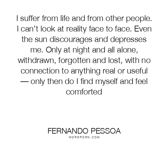 I suffer from life and from other people. I can’t look at reality face to face. Even the sun discourages and depresses me. Only at night and all alone, withdrawn, forgotten and lost, with no connection to anything real or useful — only then do I find myself and feel comforted