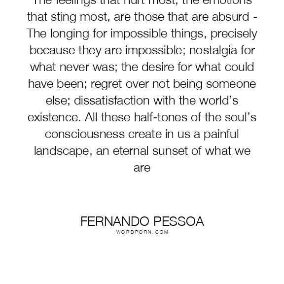 The feelings that hurt most, the emotions that sting most, are those that are absurd - The longing for impossible things, precisely because they are impossible; nostalgia for what never was; the desire for what could have been; regret over not being someone else; dissatisfaction with the world’s existence. All these half-tones of the soul’s consciousness create in us a painful landscape, an eternal sunset of what we are