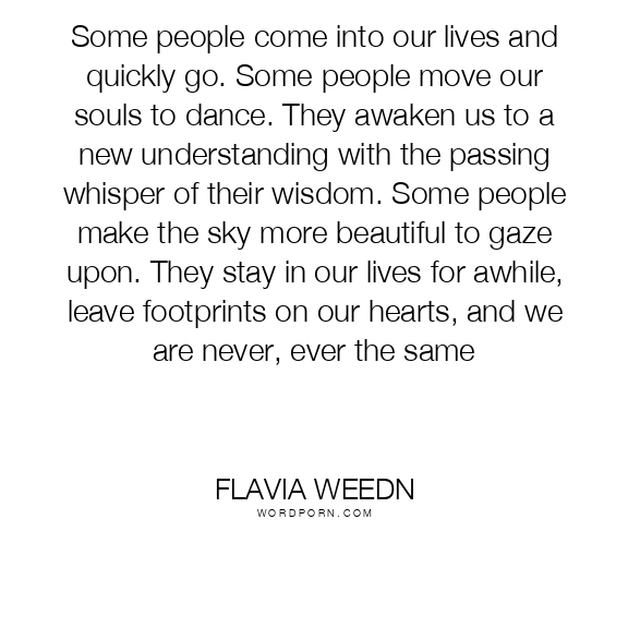Some people come into our lives and quickly go. Some people move our souls to dance. They awaken us to a new understanding with the passing whisper of their wisdom. Some people make the sky more beautiful to gaze upon. They stay in our lives for awhile, leave footprints on our hearts, and we are never, ever the same