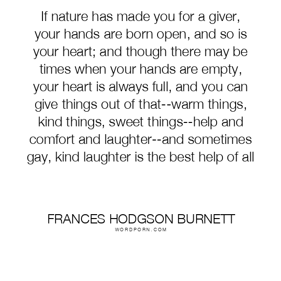 If nature has made you for a giver, your hands are born open, and so is your heart; and though there may be times when your hands are empty, your heart is always full, and you can give things out of that--warm things, kind things, sweet things--help and comfort and laughter--and sometimes gay, kind laughter is the best help of all