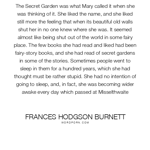 The Secret Garden was what Mary called it when she was thinking of it. She liked the name, and she liked still more the feeling that when its beautiful old walls shut her in no one knew where she was. It seemed almost like being shut out of the world in some fairy place. The few books she had read and liked had been fairy-story books, and she had read of secret gardens in some of the stories. Sometimes people went to sleep in them for a hundred years, which she had thought must be rather stupid. She had no intention of going to sleep, and, in fact, she was becoming wider awake every day which passed at Misselthwaite