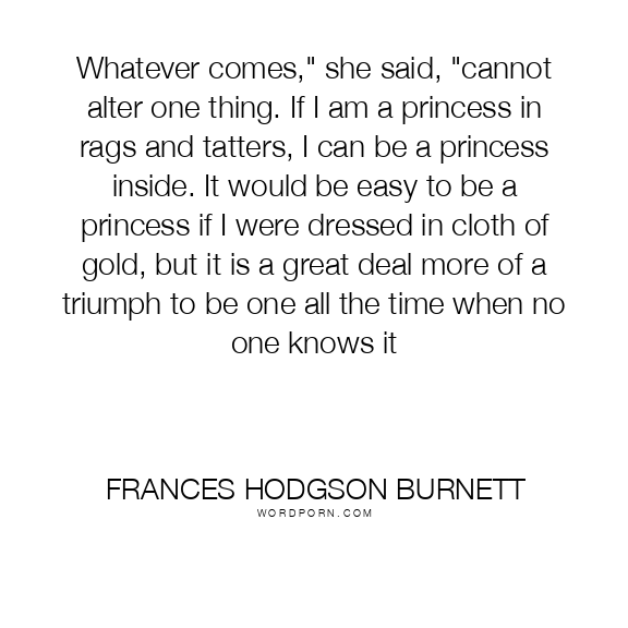Whatever comes," she said, "cannot alter one thing. If I am a princess in rags and tatters, I can be a princess inside. It would be easy to be a princess if I were dressed in cloth of gold, but it is a great deal more of a triumph to be one all the time when no one knows it