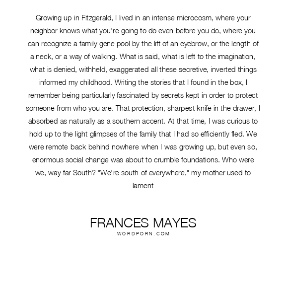 Growing up in Fitzgerald, I lived in an intense microcosm, where your neighbor knows what you're going to do even before you do, where you can recognize a family gene pool by the lift of an eyebrow, or the length of a neck, or a way of walking. What is said, what is left to the imagination, what is denied, withheld, exaggerated-all these secretive, inverted things informed my childhood. Writing the stories that I found in the box, I remember being particularly fascinated by secrets kept in order to protect someone from who you are. That protection, sharpest knife in the drawer, I absorbed as naturally as a southern accent. At that time, I was curious to hold up to the light glimpses of the family that I had so efficiently fled. We were remote-back behind nowhere-when I was growing up, but even so, enormous social change was about to crumble foundations. Who were we, way far South? "We're south of everywhere," my mother used to lament