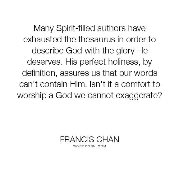 Many Spirit-filled authors have exhausted the thesaurus in order to describe God with the glory He deserves. His perfect holiness, by definition, assures us that our words can't contain Him. Isn't it a comfort to worship a God we cannot exaggerate?