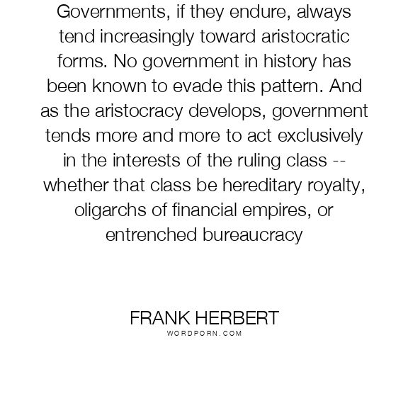Governments, if they endure, always tend increasingly toward aristocratic forms. No government in history has been known to evade this pattern. And as the aristocracy develops, government tends more and more to act exclusively in the interests of the ruling class -- whether that class be hereditary royalty, oligarchs of financial empires, or entrenched bureaucracy