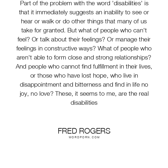 Part of the problem with the word 'disabilities' is that it immediately suggests an inability to see or hear or walk or do other things that many of us take for granted. But what of people who can't feel? Or talk about their feelings? Or manage their feelings in constructive ways? What of people who aren't able to form close and strong relationships? And people who cannot find fulfillment in their lives, or those who have lost hope, who live in disappointment and bitterness and find in life no joy, no love? These, it seems to me, are the real disabilities