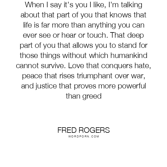 When I say it's you I like, I'm talking about that part of you that knows that life is far more than anything you can ever see or hear or touch. That deep part of you that allows you to stand for those things without which humankind cannot survive. Love that conquers hate, peace that rises triumphant over war, and justice that proves more powerful than greed