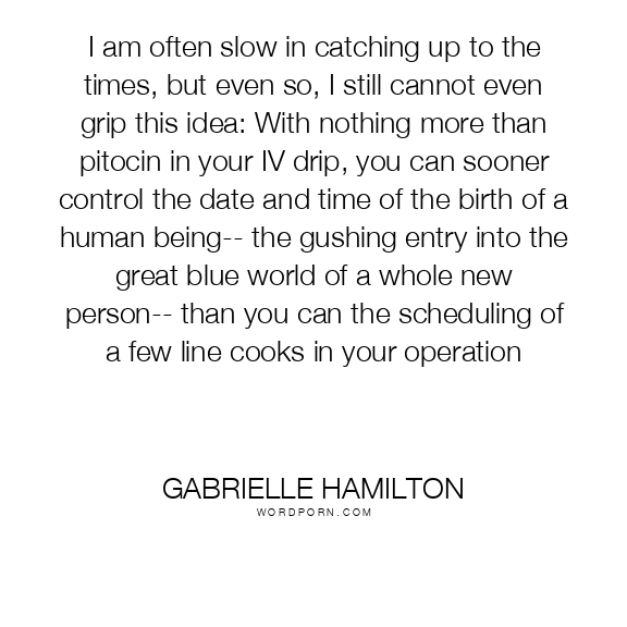 I am often slow in catching up to the times, but even so, I still cannot even grip this idea: With nothing more than pitocin in your IV drip, you can sooner control the date and time of the birth of a human being-- the gushing entry into the great blue world of a whole new person-- than you can the scheduling of a few line cooks in your operation