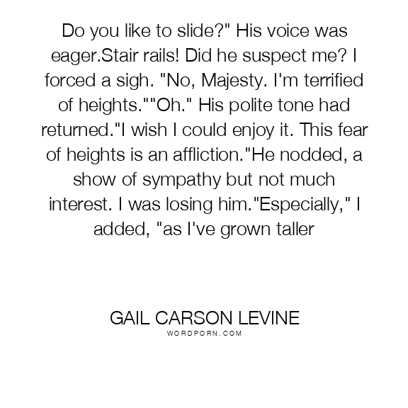 Do you like to slide?" His voice was eager.Stair rails! Did he suspect me? I forced a sigh. "No, Majesty. I'm terrified of heights.""Oh." His polite tone had returned."I wish I could enjoy it. This fear of heights is an affliction."He nodded, a show of sympathy but not much interest. I was losing him."Especially," I added, "as I've grown taller