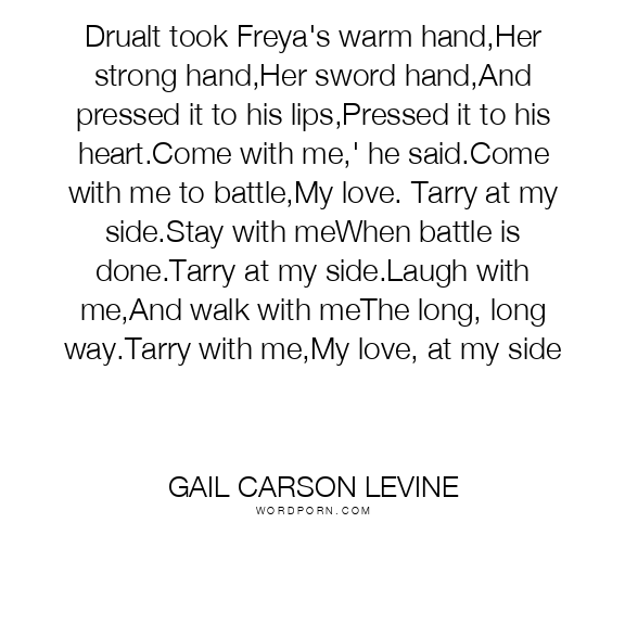 Drualt took Freya's warm hand,Her strong hand,Her sword hand,And pressed it to his lips,Pressed it to his heart.Come with me,' he said.Come with me to battle,My love. Tarry at my side.Stay with meWhen battle is done.Tarry at my side.Laugh with me,And walk with meThe long, long way.Tarry with me,My love, at my side