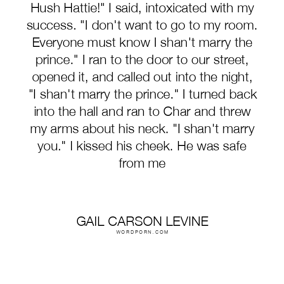 Hush Hattie!" I said, intoxicated with my success. "I don't want to go to my room. Everyone must know I shan't marry the prince." I ran to the door to our street, opened it, and called out into the night, "I shan't marry the prince." I turned back into the hall and ran to Char and threw my arms about his neck. "I shan't marry you." I kissed his cheek. He was safe from me