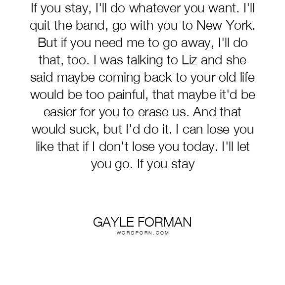 If you stay, I'll do whatever you want. I'll quit the band, go with you to New York. But if you need me to go away, I'll do that, too. I was talking to Liz and she said maybe coming back to your old life would be too painful, that maybe it'd be easier for you to erase us. And that would suck, but I'd do it. I can lose you like that if I don't lose you today. I'll let you go. If you stay