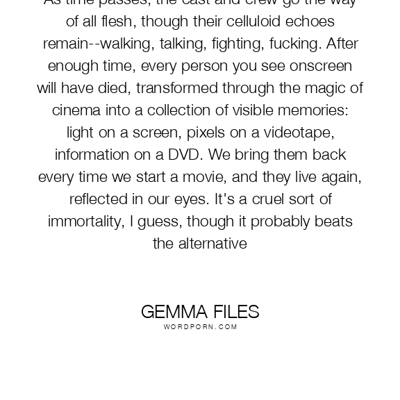 As time passes, the cast and crew go the way of all flesh, though their celluloid echoes remain--walking, talking, fighting, fucking. After enough time, every person you see onscreen will have died, transformed through the magic of cinema into a collection of visible memories: light on a screen, pixels on a videotape, information on a DVD. We bring them back every time we start a movie, and they live again, reflected in our eyes. It's a cruel sort of immortality, I guess, though it probably beats the alternative