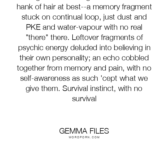 most ghosts are a rag and a bone and a hank of hair at best--a memory fragment stuck on continual loop, just dust and PKE and water-vapour with no real "there" there. Leftover fragments of psychic energy deluded into believing in their own personality; an echo cobbled together from memory and pain, with no self-awareness as such 'cept what we give them. Survival instinct, with no survival