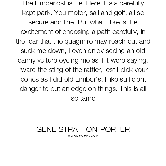 The Limberlost is life. Here it is a carefully kept park. You motor, sail and golf, all so secure and fine. But what I like is the excitement of choosing a path carefully, in the fear that the quagmire may reach out and suck me down; I even enjoy seeing an old canny vulture eyeing me as if it were saying, ‘ware the sting of the rattler, lest I pick your bones as I did old Limber’s. I like sufficient danger to put an edge on things. This is all so tame