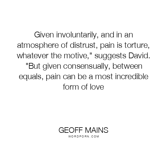 Given involuntarily, and in an atmosphere of distrust, pain is torture, whatever the motive," suggests David. "But given consensually, between equals, pain can be a most incredible form of love