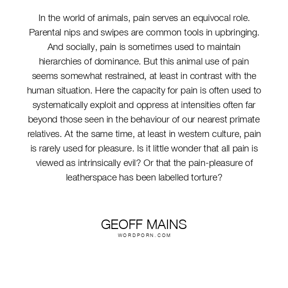 In the world of animals, pain serves an equivocal role. Parental nips and swipes are common tools in upbringing. And socially, pain is sometimes used to maintain hierarchies of dominance. But this animal use of pain seems somewhat restrained, at least in contrast with the human situation. Here the capacity for pain is often used to systematically exploit and oppress at intensities often far beyond those seen in the behaviour of our nearest primate relatives. At the same time, at least in western culture, pain is rarely used for pleasure. Is it little wonder that all pain is viewed as intrinsically evil? Or that the pain-pleasure of leatherspace has been labelled torture?