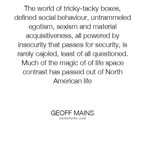 The world of tricky-tacky boxes, defined social behaviour, untrammeled egotism, sexism and material acquisitiveness, all powered by insecurity that passes for security, is rarely cajoled, least of all questioned. Much of the magic of of life space contrast has passed out of North American life