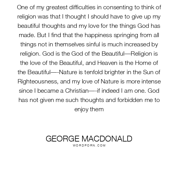 One of my greatest difficulties in consenting to think of religion was that I thought I should have to give up my beautiful thoughts and my love for the things God has made. But I find that the happiness springing from all things not in themselves sinful is much increased by religion. God is the God of the Beautiful—Religion is the love of the Beautiful, and Heaven is the Home of the Beautiful—-Nature is tenfold brighter in the Sun of Righteousness, and my love of Nature is more intense since I became a Christian—-if indeed I am one. God has not given me such thoughts and forbidden me to enjoy them