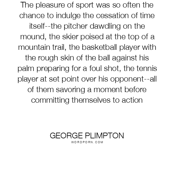The pleasure of sport was so often the chance to indulge the cessation of time itself--the pitcher dawdling on the mound, the skier poised at the top of a mountain trail, the basketball player with the rough skin of the ball against his palm preparing for a foul shot, the tennis player at set point over his opponent--all of them savoring a moment before committing themselves to action
