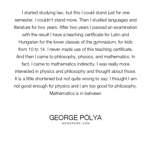I started studying law, but this I could stand just for one semester. I couldn't stand more. Then I studied languages and literature for two years. After two years I passed an examination with the result I have a teaching certificate for Latin and Hungarian for the lower classes of the gymnasium, for kids from 10 to 14. I never made use of this teaching certificate. And then I came to philosophy, physics, and mathematics. In fact, I came to mathematics indirectly. I was really more interested in physics and philosophy and thought about those. It is a little shortened but not quite wrong to say: I thought I am not good enough for physics and I am too good for philosophy. Mathematics is in between